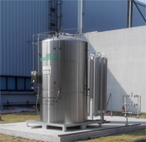 CE(真空断熱貯槽)内に、タンクローリーより液化ガスを受入れ、超低温の液化状態で貯蔵します。供給時は、ガス内圧により液体を送り出し、アルミ製の気化器により大気と熱交換し気化させた後、減圧設備で所定の圧力まで調整しガスを供給します。