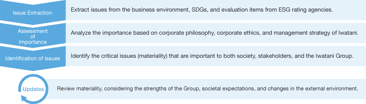 At Iwatani, we consider a sound understanding of and efforts to achieve the Sustainable Development Goals (SDGs) adopted by the United Nations in 2015, essential aspects of identifying materiality. By validating the relationship between each materiality and the 17 Goals and 169 Targets of the SDGs and identifying which SDGs relate to each materiality, the Iwatani Group will contribute to widespread innovations throughout society.