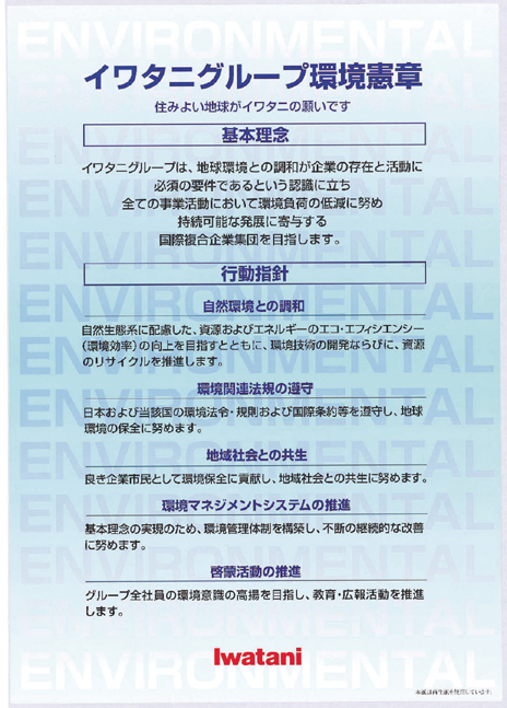 岩谷自1970年为纪念创业40周年发表企业标语“岩谷以创建美好地球为愿”以来,把地球馈赠于人类的“气体&能源”作为事业的核心来推进环境经营。1998年制定了“岩谷集团环境宪章”,整个集团都为之努力实践。