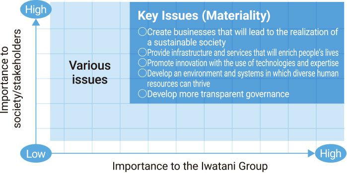We choose as material items key aspects deemed highly important along the axes of both importance to the Iwatani Group (horizontal axis) and importance to society/stakeholders (vertical axis).